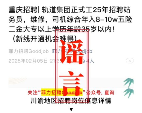 对此,重庆轨道集团辟谣称,该招聘信息是假的,集团所有招聘信息目前仅通过“重庆轨道交通”新浪微博、微信公众号、官方网站(https://www.cqmetro.cn/)及“渝畅行”App四个官方渠道发布。而且,重庆轨道集团官方网站是唯一招聘渠道。